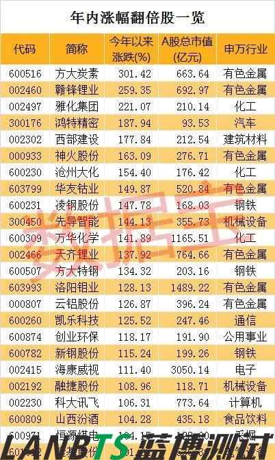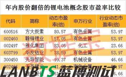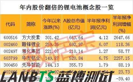 數(shù)據(jù)寶統(tǒng)計顯示,剔除近一年上市的次新股,25只個股年內漲幅在100%以上。值得注意的是,7只個股來自鋰電池板塊,分別是方大炭素(600516)、贛鋒鋰業(yè)(002460)、雅化集團、華友鈷業(yè)(603799)、先導智能(300450)、天齊鋰業(yè)(002466)、融捷股份(002192)。