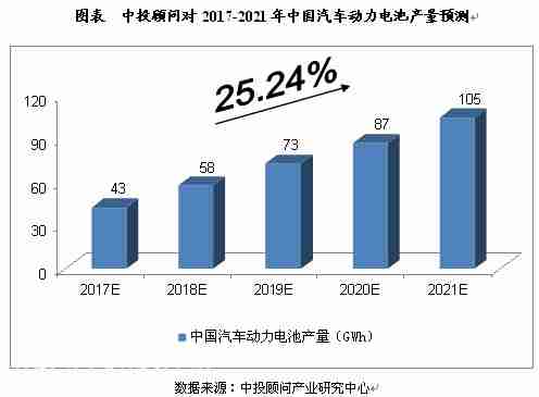 綜合以上因素,我們預(yù)計(jì),2017年我國(guó)汽車動(dòng)力電池產(chǎn)量將達(dá)到43GWh,未來(lái)五年(2017-2021)年均復(fù)合增長(zhǎng)率約為25.24%,2021年將達(dá)到105GWh。