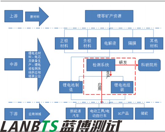 鋰離子電池產(chǎn)業(yè)鏈上游為:鋰礦產(chǎn)資源--中游為鋰電池材料--電芯生產(chǎn)--電芯生產(chǎn)裝備--鋰電池檢測系統(tǒng)提供商和鋰電池組裝企業(yè)--下游主要是鋰電池配套應用領域,包括 3C 產(chǎn)品、電動工具、電動自行車、新能源汽車、儲能等行業(yè)。