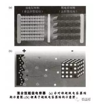 混合型超級電容器一般是指由不同類型正負(fù)極電極材料組成的器件:一極是含贗電容電池材料,另一極是雙電層電容器材料。混合型臟電容器結(jié)合了雙電層材料的快速充放電和贗電容的高能m密度的特性,可同時(shí)具有高功率密度和高能量密度,彌補(bǔ)了在電池和超級電容器兩者不可兼得的空缺。